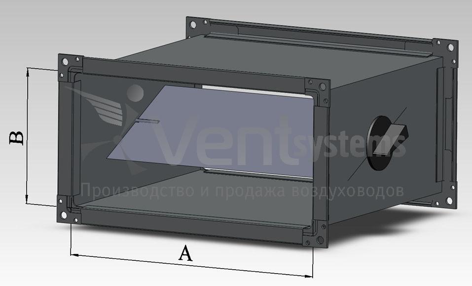 Данный дроссель-клапан имеет прямоугольную форму и устанавливается в вентиляционных каналах прямоугольного сечения.